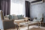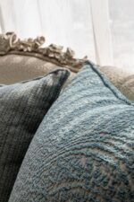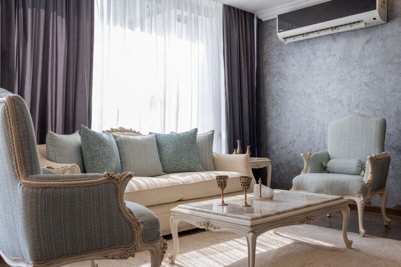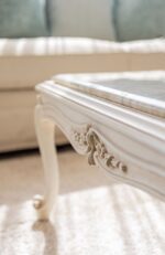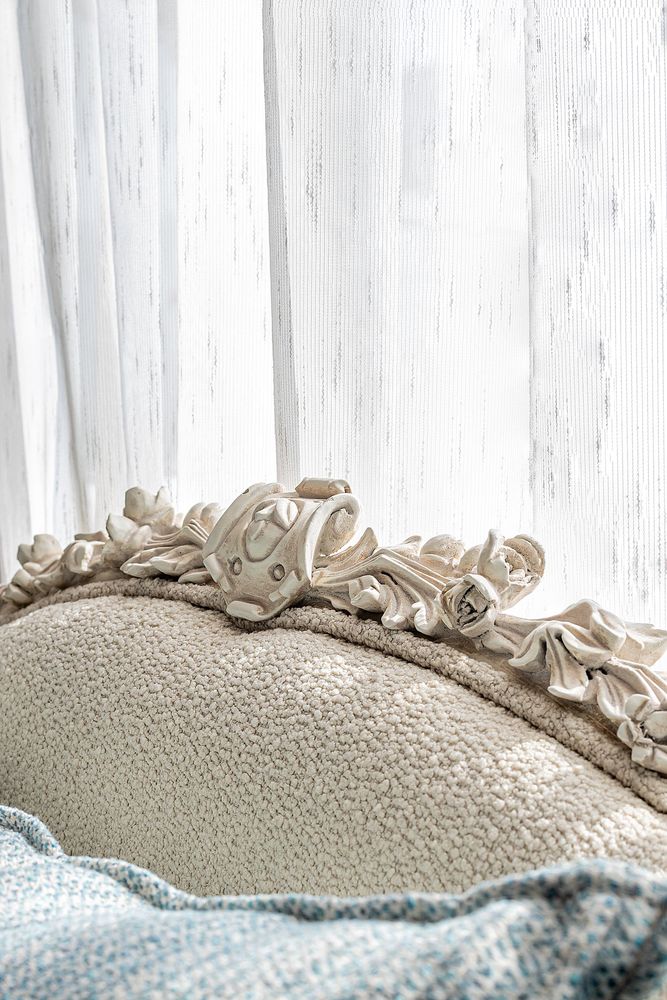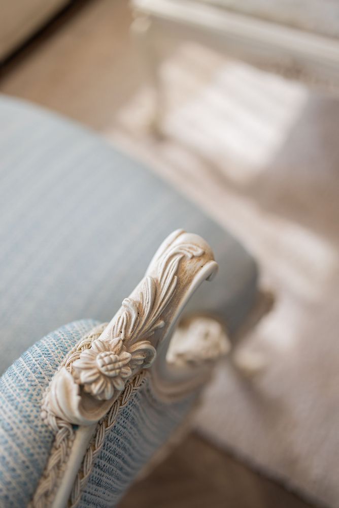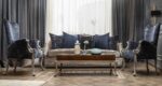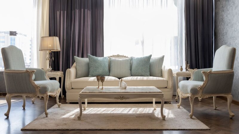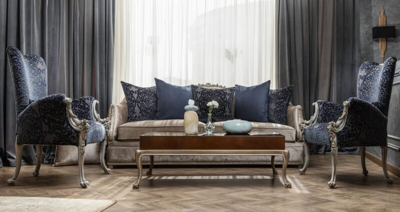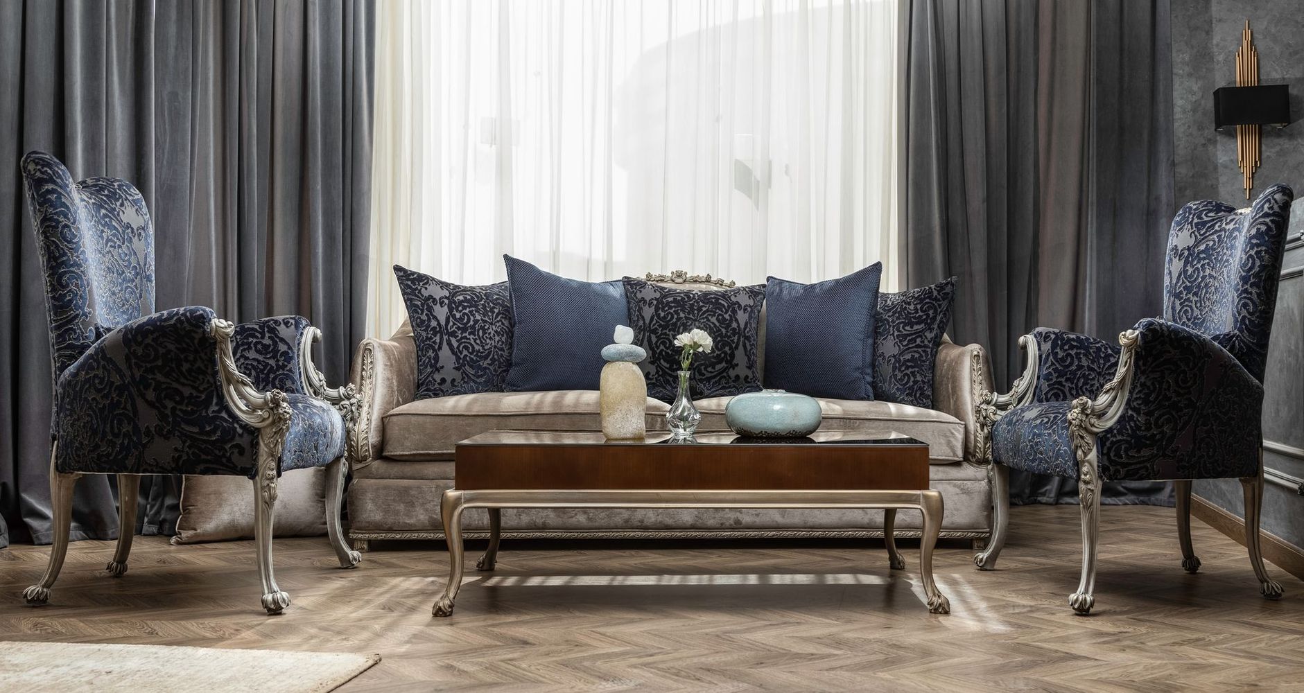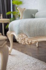 This furniture salon set has a classic, elegant design with a vintage-inspired aesthetic. It includes a central sofa with plush cushions and a curved, detailed frame, complemented by two matching high-back armchairs with carved wooden legs and trim. The upholstery is in light, pastel shades, such as cream or pale blue, contributing to a refined and soft atmosphere. The set is arranged around a rectangular coffee table with ornate, carved legs, all placed on a cozy rug. Flanking the sofa are small side tables, and a delicate table lamp adds warm lighting. Overall, the furniture exudes grace and timeless charm.
